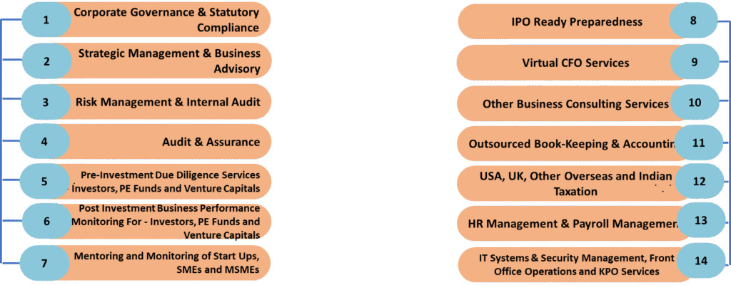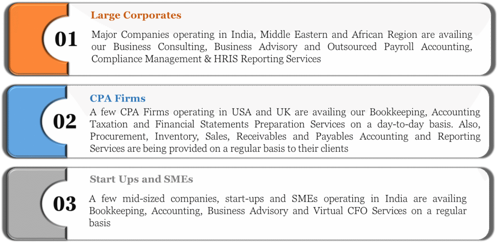 We are a Business Consulting, Business Advisory and BPO & KPO Company, established about an year ago in Bangalore India, with offices across PAN India, UAE and Saudi Arabia. The Company is managed by two directors, along with a talent pool of about 20 CA, ICWA, CS, CPA, ACCA, MBA, CIA, CMA, CFE, CISA and CFA Professionals.
